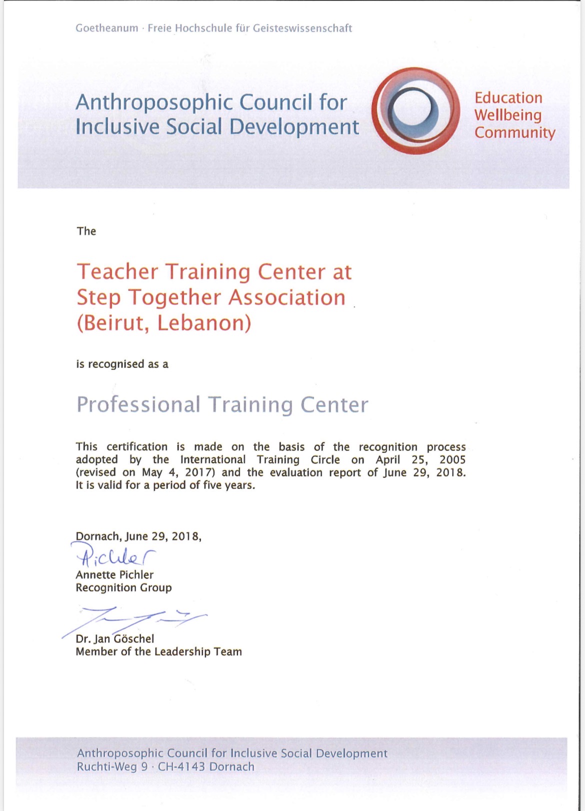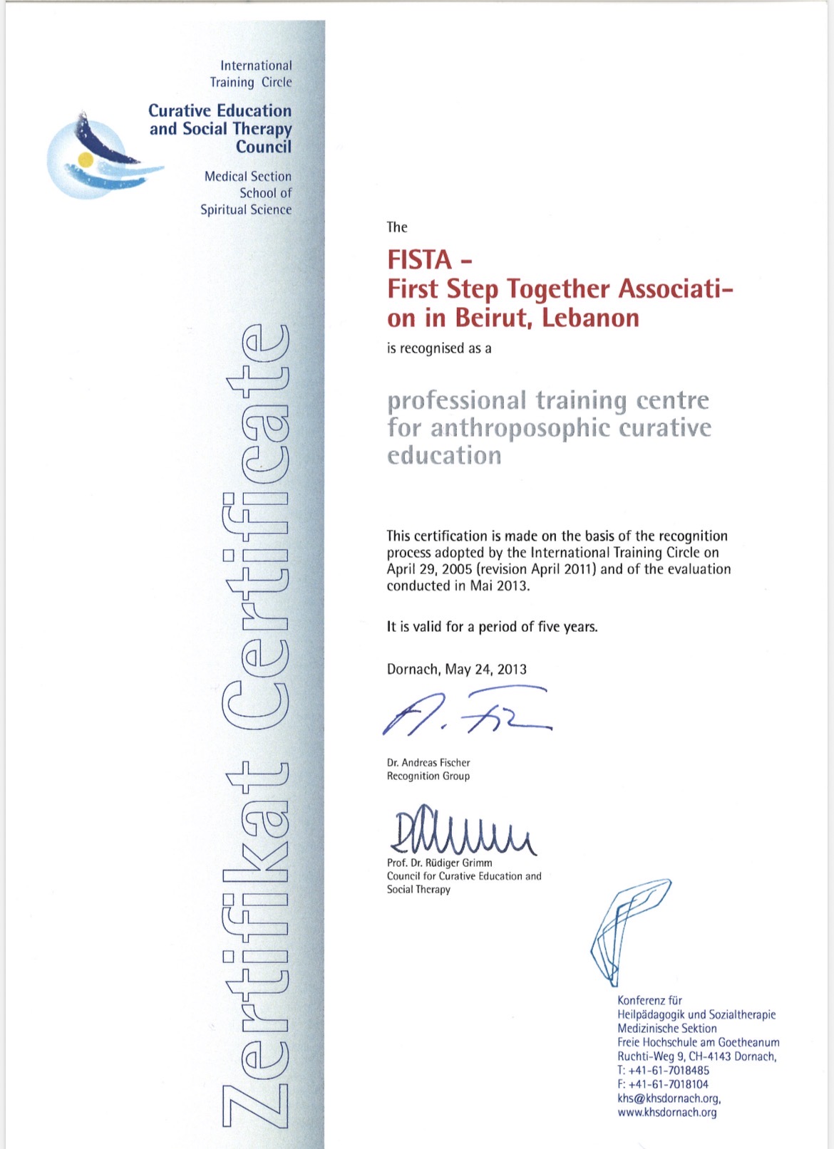 We are part of the worldwide movement Friends of the Waldorf Education in Berlin and our teacher-training program is accredited by the International Council of Curative Education in Dornach, Switzerland. Step Together is the only registered school and community in the Middle East that follows the principles of Rudolf Steiner.